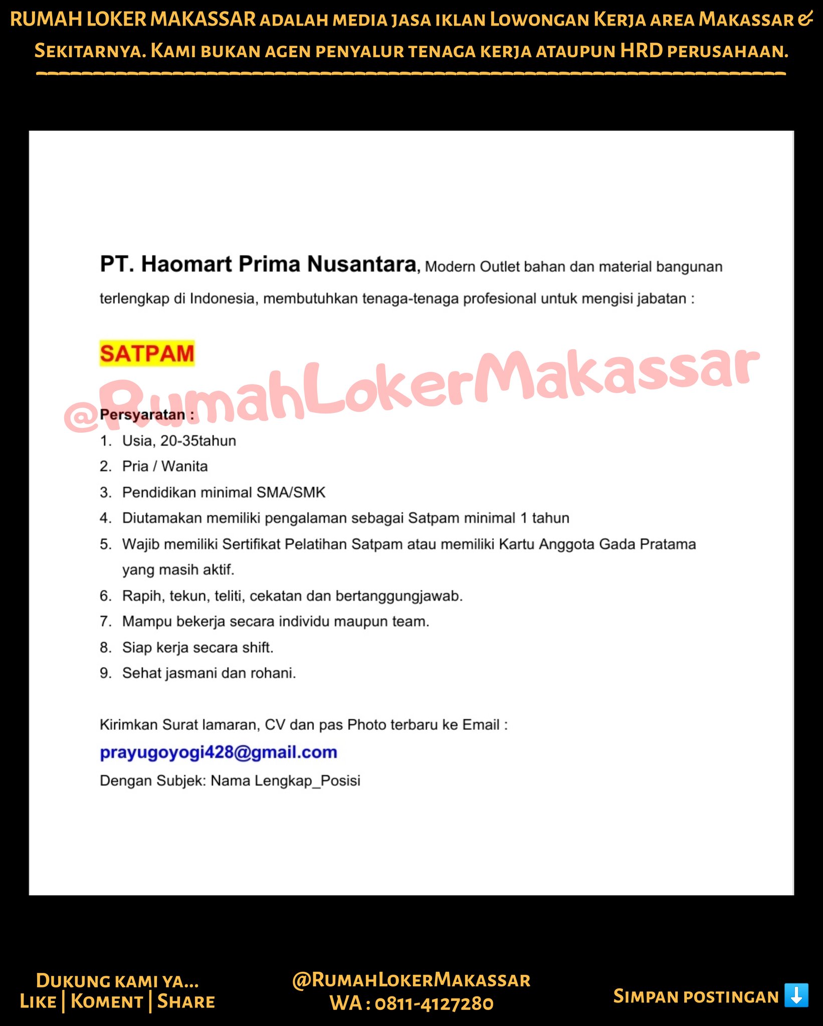 Rumah Loker Makassar On Twitter Pt Haomart Prima Nusantara Modern Outlet Bahan Dan Material Bangunan Terlengkap Di Indonesia Membutuhkan Admin Gudang Satpam Kasir Spg Spb Kirimkan Surat Lamaran