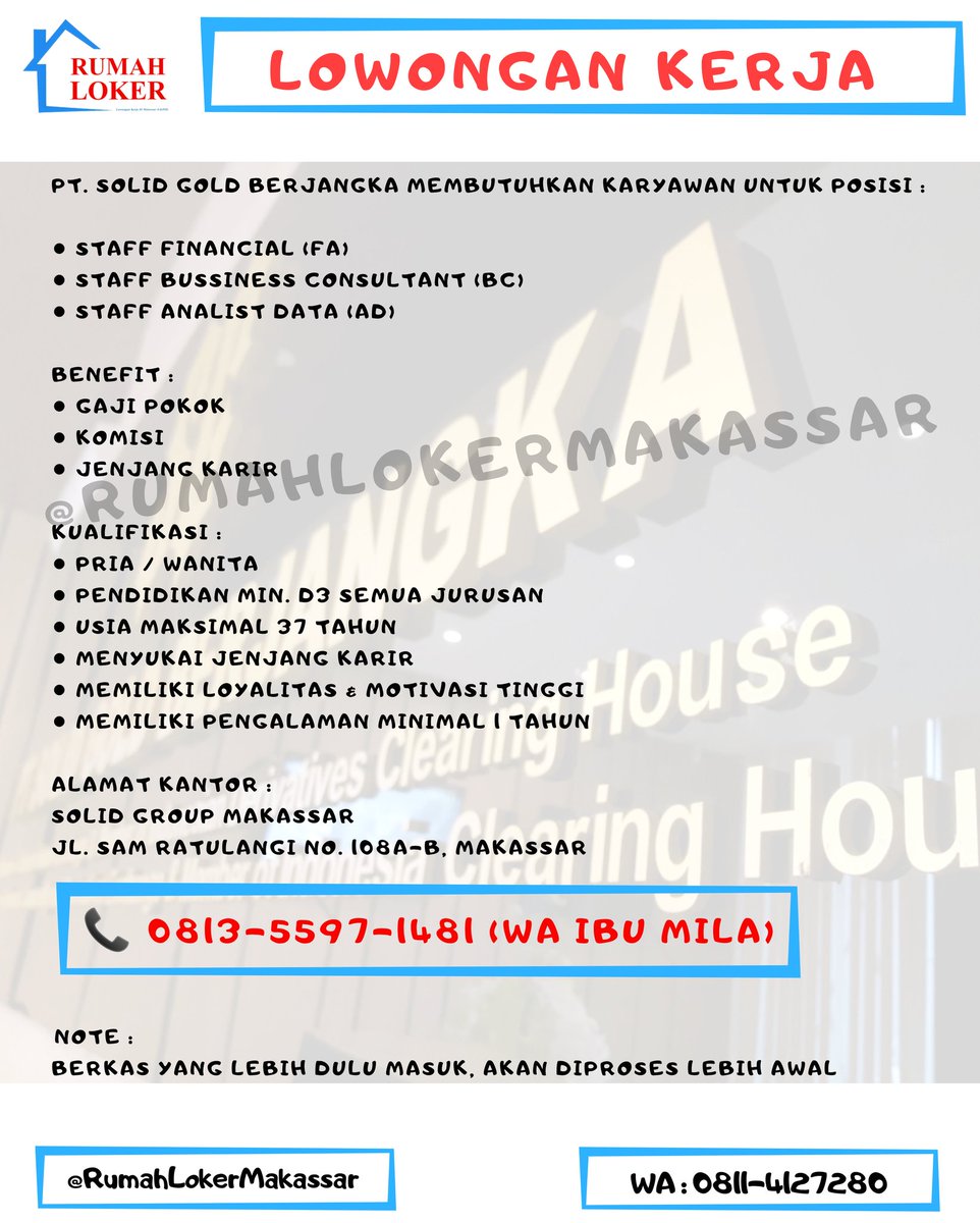 Rumah Loker Makassar Na Twitteru Alamat Kantor Solid Group Makassar Jl Sam Ratulangi No 108a B Makassar 0813 5597 1481 Wa Ibu Mila Chat Wa Klik Https T Co Lan7xvrt1o Berkas Yang Lebih Dulu Masuk